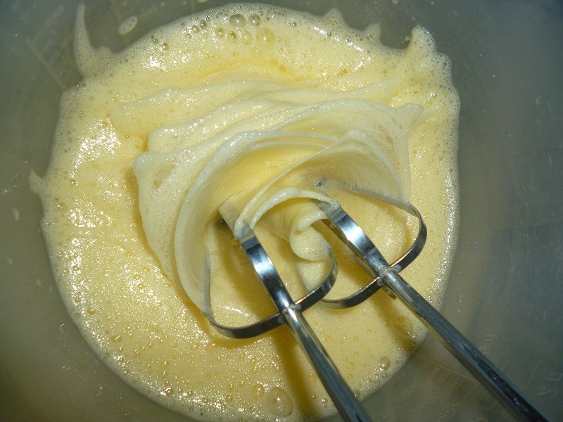 Do miski wlej szklankę kefiru, dodaj cukier i wbij dwa jajka, następnie przy pomocy miksera wymieszaj składniki.