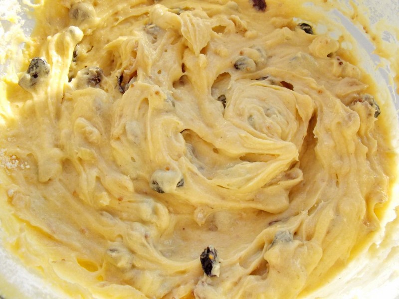 Kiedy składniki się połączą, zacznij stopniowo dodawać niewielką ilość mąki, cały czas mieszając całość przy pomocy miksera. Kiedy cała mąka będzie już połączona z pozostałymi składnikami, dodaj proszek do pieczenia oraz rodzynki i ponownie wymieszaj ciasto.