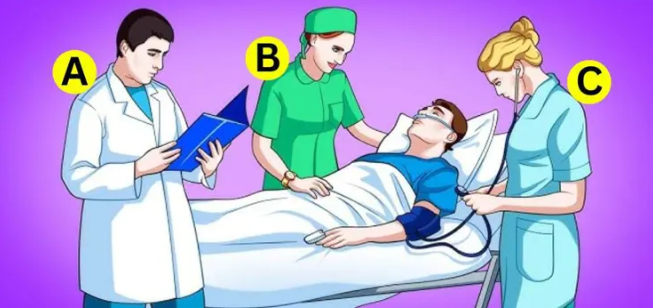 Złodziejem jest opcja B! 🕵️‍♀️ Jeśli spojrzysz uważnie, zobaczysz, że ma w ręce zegarek pacjenta, który najprawdopodobniej ukradła!