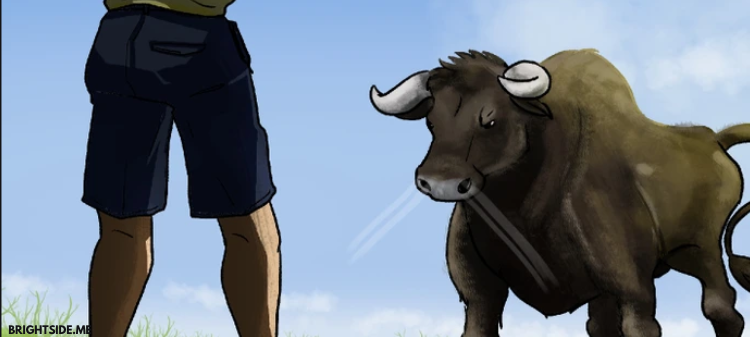 Byki reagują na ruch. Dlatego jeśli zwierzę biegnie w twoją stronę – nie ruszaj się. Gdy zbliży się niebezpiecznie blisko, rzuć w inną stronę kapelusz lub ubranie – odciągniesz jego uwagę.
